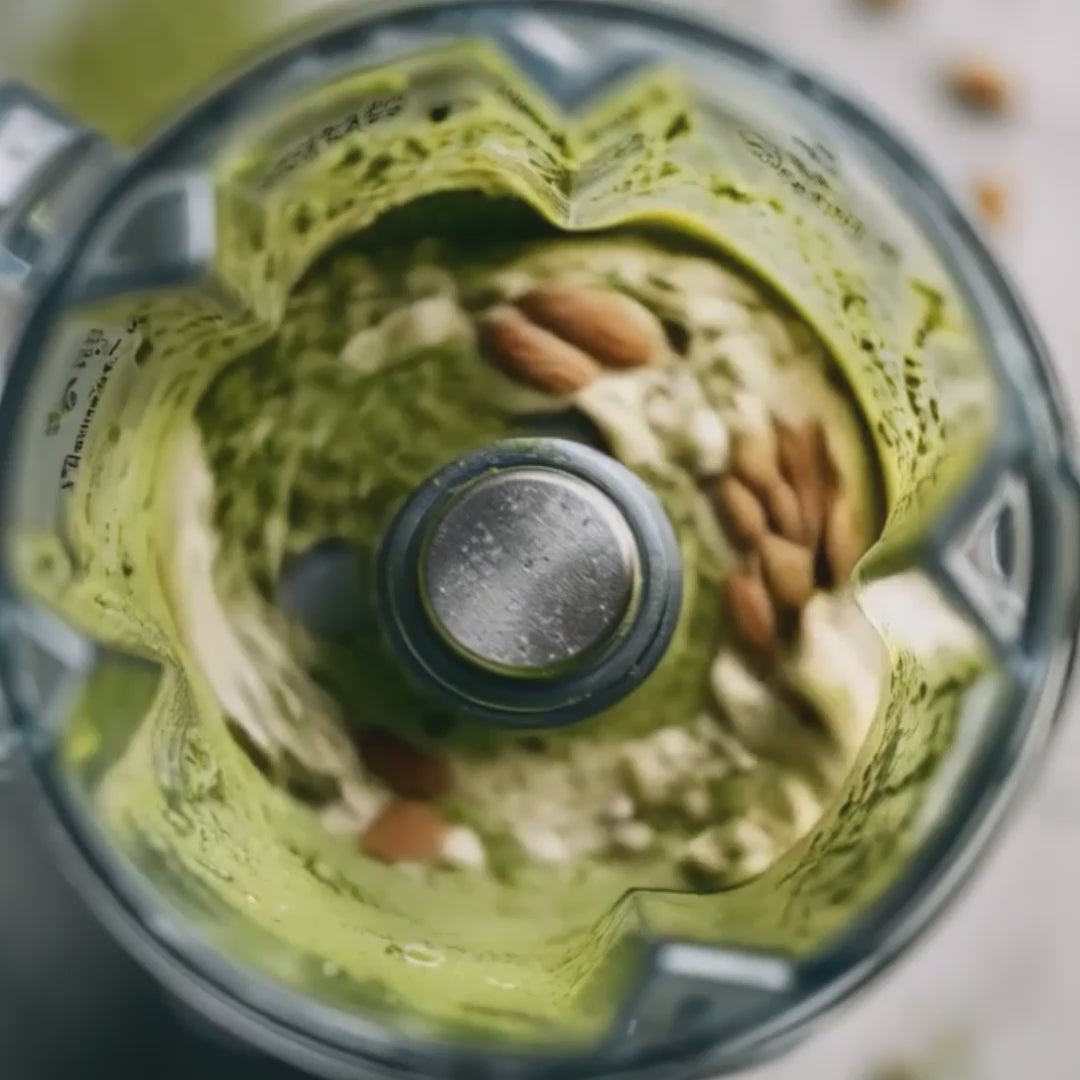 Almond, date, egg white protein, collagen, matcha.
